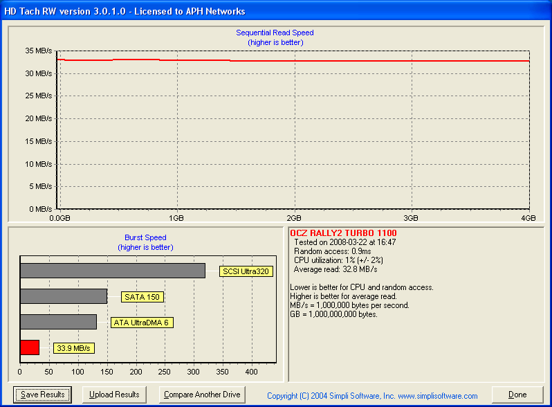 In the past, we've complained quite a bit about latency issues with OCZ flash drives. We are delighted to see OCZ addressing this problem for everything they've released in the past year and a half. If the OCZ Rally2 Turbo 4GB's performance crown was hindered by the latency of the drive, that would certainly be a party pooper. Fortunately, the OCZ Rally2 Turbo 4GB that we've tested takes home the performance crown once more -- at 0.9ms. it's certainly within the acceptable range of 1.0ms latency (Anything below 1.0ms doesn't really matter). Performance across the flash drive is very consistent as well -- our HDTach Full Bench run shows a consistent 32.8MB/s read speed on our Intel ICH9R controlled USB ports, as well as a maximum burst rate 33.9MB/s.