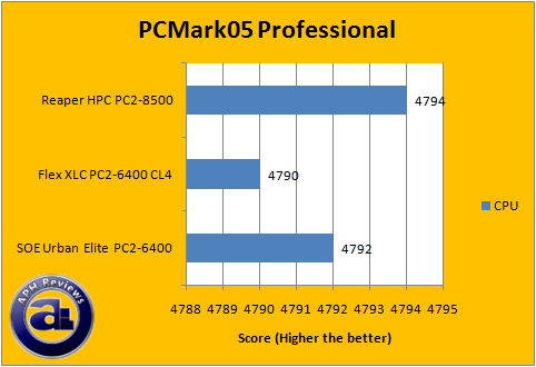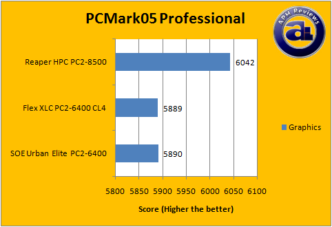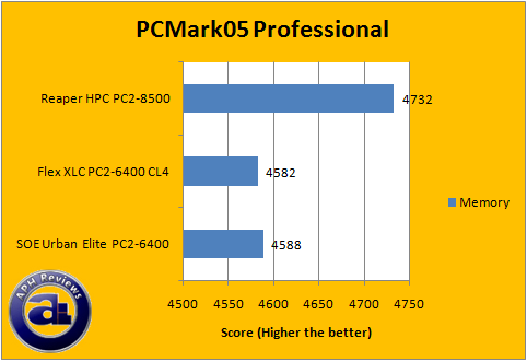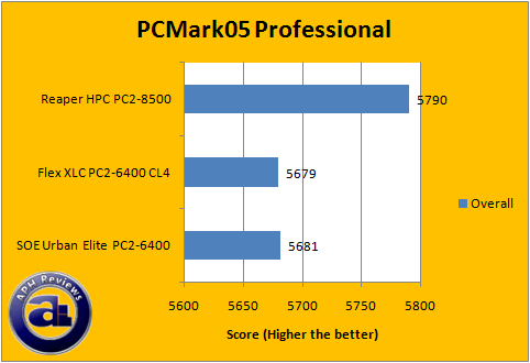On the other hand, using OCZ's Reaper HPC PC2-8500 RAM brings us higher PCMark05 mark -- and makes it a little more obvious as well. It seems that Core 2 based platforms really benefits more from RAM bandwidth, despite the fact that the RAM is running at a higher speed (In this case, 2:1) than the CPU FSB.