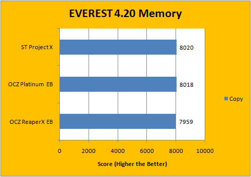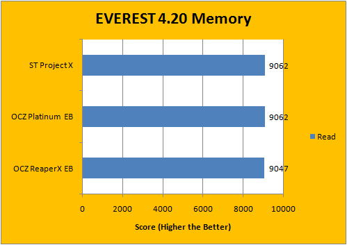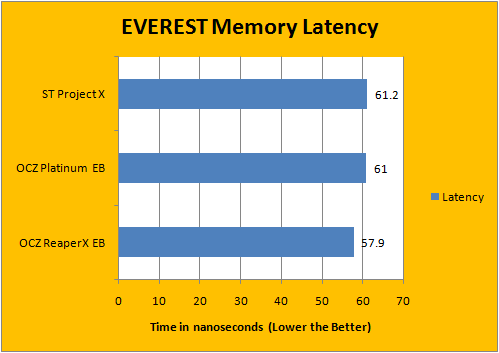 With FSB set to 400MHz, it's just a matter of running the memory at different dividers at the same FSB -- which means that the extra maximum bandwidth set at a higher divider didn't benefit much in regards to the EVEREST memory benchmarks. While we found that to be quite surprising judging by the EVEREST CPU Photoworxx score, there's one thing that the OCZ ReaperX HPC certainly benefited from -- lower memory latency, as shown in our EVEREST Memory Latency benchmark.