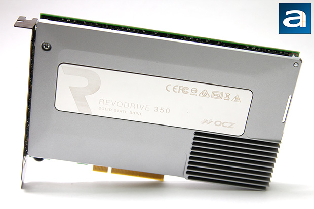 The OCZ RevoDrive 350 480GB looks nothing like your traditional Serial ATA solid state drive, and this is because it is not your traditional solid state drive. At first glance, it reminded me of a dedicated sound card equipped with an EMI shield, except the RevoDrive 350's "shield" is really a large aluminum heatsink made to dissipate heat away from the RAID controller. A matrix of holes on the rear expansion slot brackets provides additional ventilation. As you can see in our photo above, a series of fins at the bottom right corner directly corresponds to the chip residing below it. We will talk about that in just a short moment. Meanwhile, the rest of the silver shield covers the rest of the printed circuit board, along with a reflective, fingerprint loving mirror finish in the middle. This combination is not exactly a product photographer's best friend, especially if you want to grab it on a white background, haha. In the reflective portion of things, you will find a large stylized "R" on the left, RevoDrive 350 Solid State Drive text adjacent to it, as well as OCZ's logo at the end. The usual array of regulatory certification icons can be found at the top right corner.