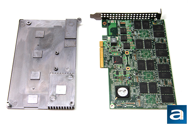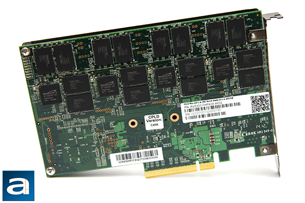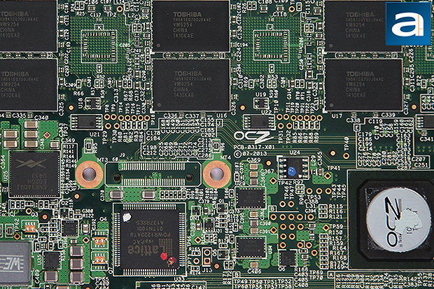 The aluminum heatsink is relatively easy to remove. Simply detach four screws, and you are good to go. Unlike most solid state drives I have encountered in the past, there are no warranty seals on any of the screws, so if you are curious enough to take a look inside, you are happy to know your three year warranty is kept intact. Sixteen additional Toshiba TH58TEG7DDJBA4C NAND ICs are found on this side of the board. The heatsink makes contact with a chip labeled 'OCZ ICT-0262' by a thermal pad; the rest of the shield is more of an aesthetics feature, because it does not directly cool any other electronic components. The chip in question, of course, is the RAID controller. No one seems to know much about it other than OCZ themselves, but what makes it special is the software virtualization layer, Virtualized Controller Architecture 2.0, that sits on top of the hardware. It not only takes care of the four SF-2282 controllers in RAID 0 as aforementioned, but this updated iteration of the original VCA expands on the feature set by enabling TRIM, NCQ, TCQ, SMART monitoring, power failure management, as well as wear leveling. This is pretty important, because if you RAID your own disks, you are bound to lose out on some features (See article "SSD: One for all or two for RAID?", March 2012). VCA 2.0 presents an entire storage subsystem that controls the flash controllers, and enables some enterprise features found only on more expensive products. Queue the "Yo dawg... I heard you like to control while you are controlling, so here is a controller..." Anyway, it comes with a SATA to PCIe bridge, but requires custom software and drivers to run.