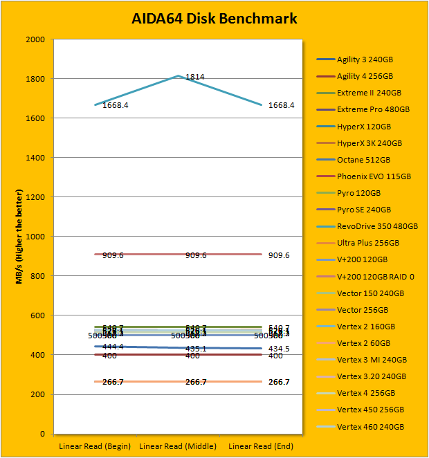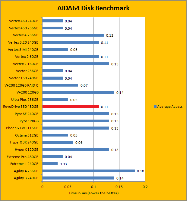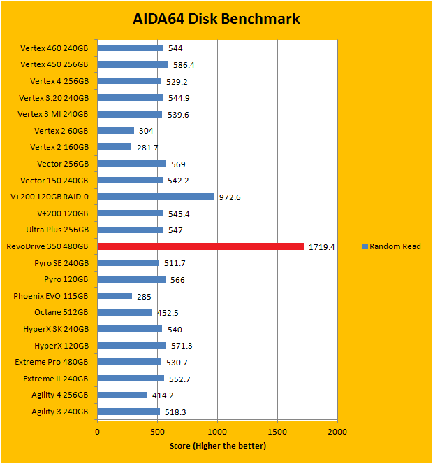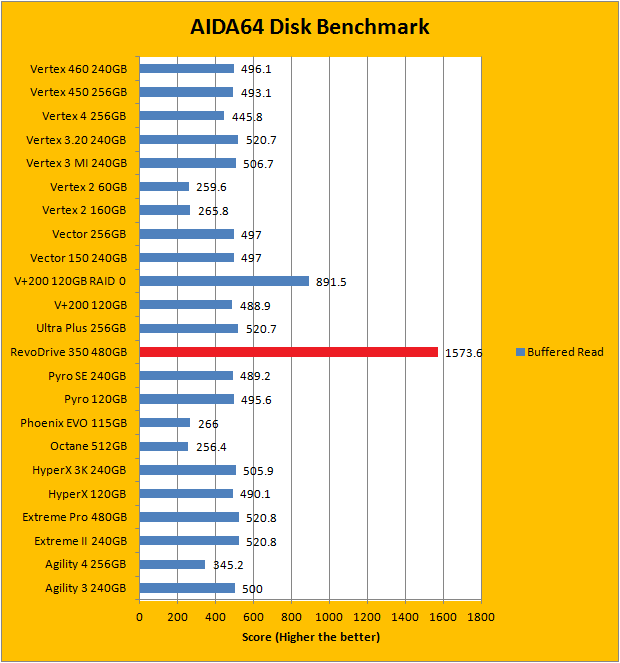 Since our SSD review benchmark results are presented in alphabetical order, first up on the list are results from one of our favorite benchmarking programs, AIDA64 Extreme Engineer. Just to note, AIDA64 Extreme Engineer is a full synthetic benchmark. Unlike full synthetic motor oil, this usually does not always carry a good connotation. While it is not a representation of real life performance (Such as how fast Photoshop opens), it does provide valuable insight into performance between different drives and different controllers. As you can see in our graphs above, the OCZ RevoDrive 350 480GB completely destroyed the competition in every speed test. Needless to say, it was not even close. Peaking at 1814MB/s in sequential read, 1719.4MB/s in random read, and 1573.6MB/s in buffered read, this is a seriously fast drive. The only test it fell behind was the average access time at 0.11ms, but it is not going to make a difference in real life, since this figure is already so low anyway.