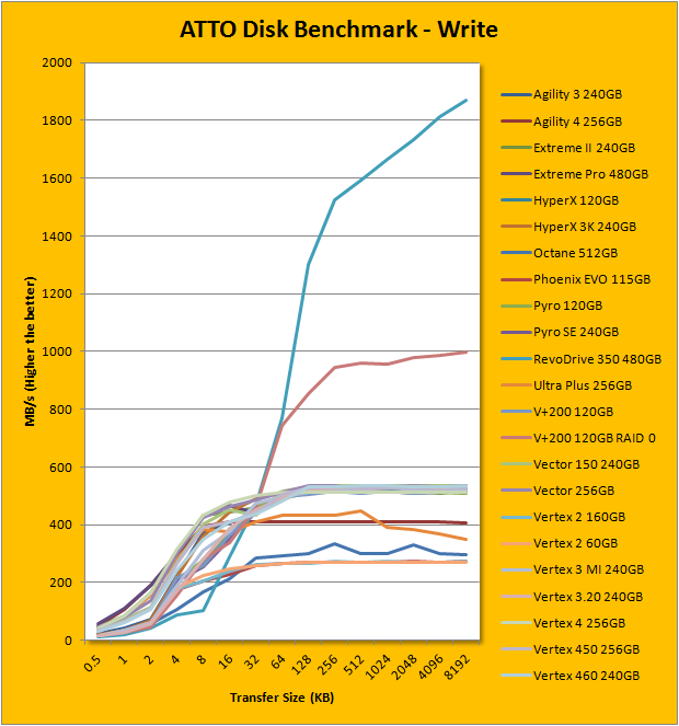 Following up next is our usual ATTO read and write tests. ATTO is an often quoted benchmark, because it is easy to use and accurate. For the most part, it is a favorite among reviewers, and I have grown to embrace it as much as the next for the last little while. ATTO uses easily compressible data, so SandForce based SSDs will perform very well here; the OCZ RevoDrive 350 480GB being essentially four of them is RAID 0 is certainly no exception. As manufacturer peak read and write performance ratings can usually be verified by ATTO, whether a drive lives up to its marketing claims or not can be tested by this program. OCZ claims the RevoDrive 350 480GB's maximum read and maximum write is pinned at 180MB/s and 1700MB/s, respectively. This is almost four times as fast as some of the best Serial ATA SSDs in the market today. According to our tests, these figures seem to be even slightly underrated, no joke. It peaked at 1983.513MB/s read and 1869.699MB/s write in the curves demonstrated in our charts above. I do not know about you, but I think this is flat out impressive. One thing to note is the OCZ RevoDrive 350 is a little slower than your average SSD at 16K and below, but it really ramps up at 32K and above.