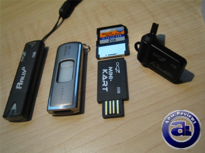 A size comparison with other flash drives. From top left: OCZ Rally2, SanDisk Cruzer Titanium U3, OCZ SD Dual, OCZ Mini-Kart, and OCZ Roadster.