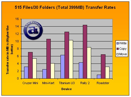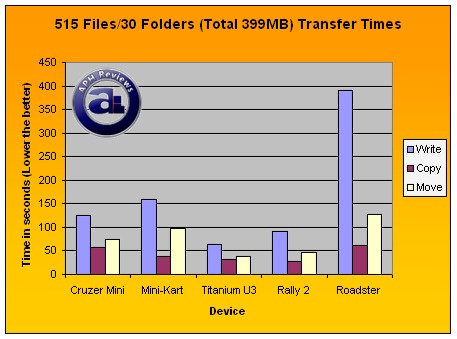The first series of tests are 515 files of write/copy/move. The total combined file size is 399 MB and contains a variety of different files, as mentioned earlier.