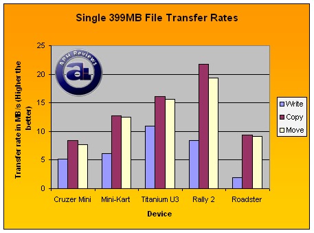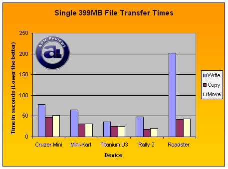 Moving onto the multifile move, which is usually determined by both the drive's write and read speed, the OCZ Roadster again did not as optimally as limited by its write speed. Again, OCZ's Roadster is the slowest of the bunch completing the move utilizing 126.93 seconds (3.14 MB/s). OCZ's Mini-Kart 1GB, although slowest next up on the charts, completed at 98.28 seconds (4.10 MB/s). Our fastest drive in this portion of our tests is the Cruzer Titanium U3 2GB at 38.75 seconds (10.30 MB/s).