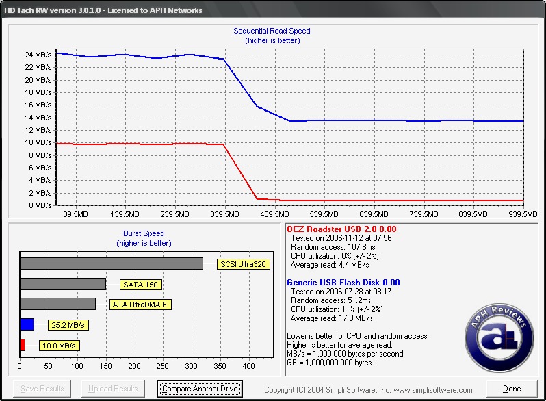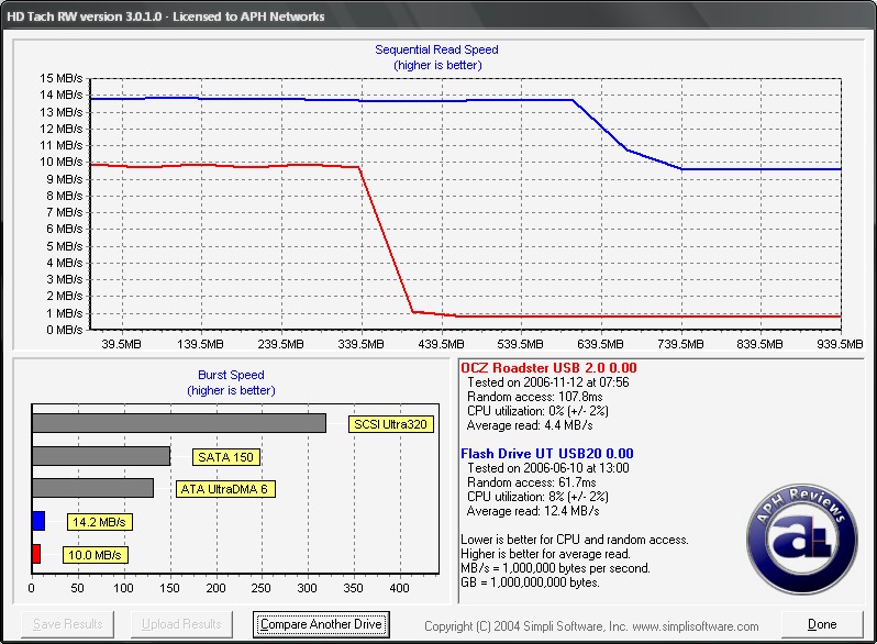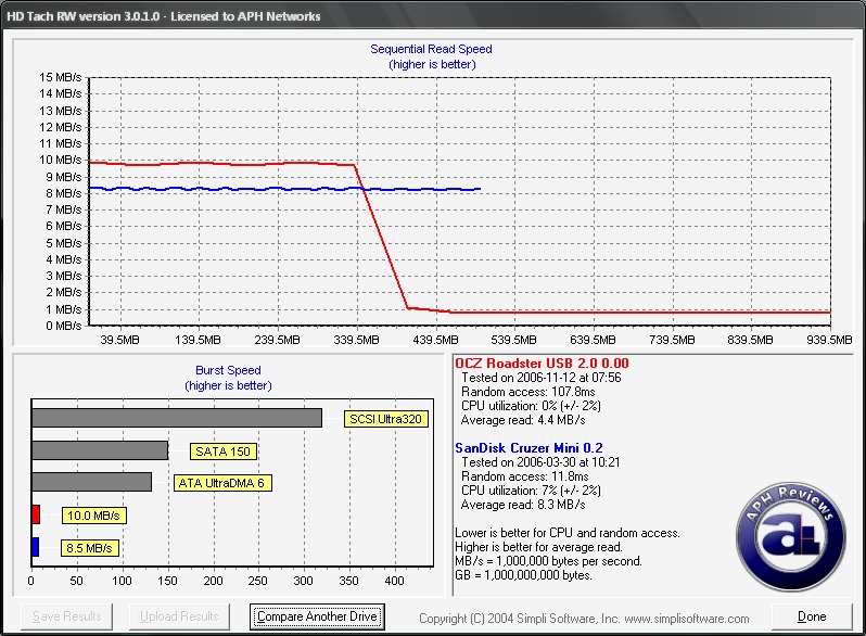 We've tested the OCZ Roadster against a SanDisk Cruzer Mini 512MB using HDTach in this test. Let's go over the things that remain the same in all other tests; which include performance of the OCZ Roadster itself. Optimally, when using flash memory, there should be minimal latency or random access time. It seems to us that the OCZ Roadster has pretty bad random access latencies at 107.8 ms. For the most part, the OCZ Roadster stayed at approximately 0.8 MB/s according to HDTach at the ends of the drive after the big drop.