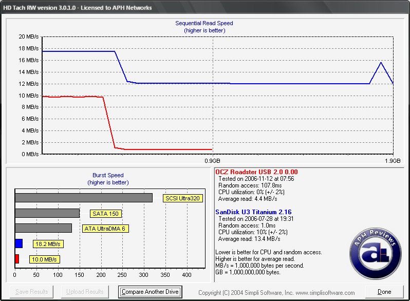 As you can obviously see, the Cruzer Titanium U3 is a lot faster than the Roadster. Although read speed is not the primary strength of the Titanium (Write is, however), it is still considerably faster than OCZ's Roadster. If you take a look at the latency of each device, it should become apparent to you that the SanDisk Cruzer Titanium U3 has the lowest random access time of 1 ms -- basically the ideal latency. Note that the Cruzer Titanium U3 and OCZ Roadster are different types of product: One aimed for performance and durability, while the latter intended for incredibly small physical size.