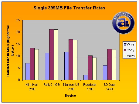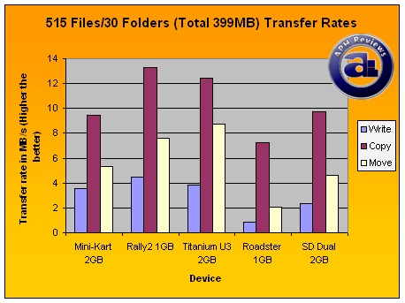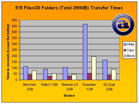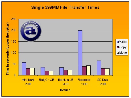Usually, the move tests are slower than the copy tests as write performance of the drive is a contributing factor. Again as demonstrated here, but this time SanDisk's Titanium U3 completed the test at an impressive 45.54 seconds (8.76MB/s). The Rally2 followed at a relatively close distance of 52.38 seconds (7.62MB/s). The Mini-Kart and SD Dual finished the multifile move test at 75.03 seconds (5.32MB/s) and 86.02 seconds (4.64MB/s), respectively. OCZ Roadster definitely took its time -- 195.07 seconds is quite a long time with move speed at 2.05MB/s.