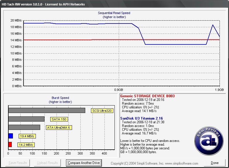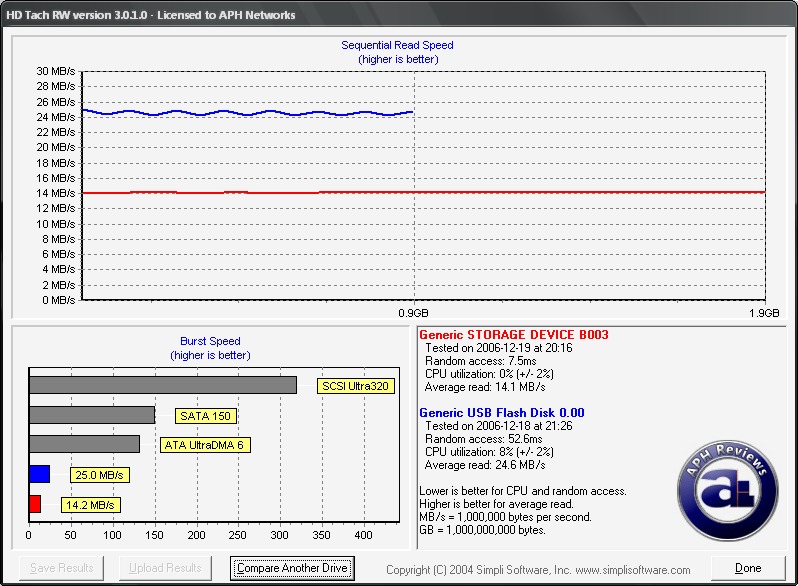 Interestingly, the results of HDTach with OCZ's Mini-Kart 2GB is significantly different from our real-world APH proprietary file copy tests. While the Mini-Kart 2GB is the top performing ultra-small drive in our tests, it is in the bottom with HDTach. We are not entirely sure what's happening here, but it's been confirmed with over 4 separate computers.