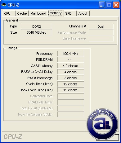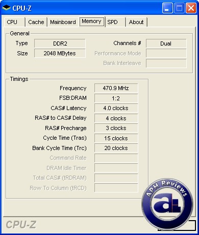 The RAM can hit 470MHz (DDR2-940) at 4-4-3-15 without any problems at 2.1V.
