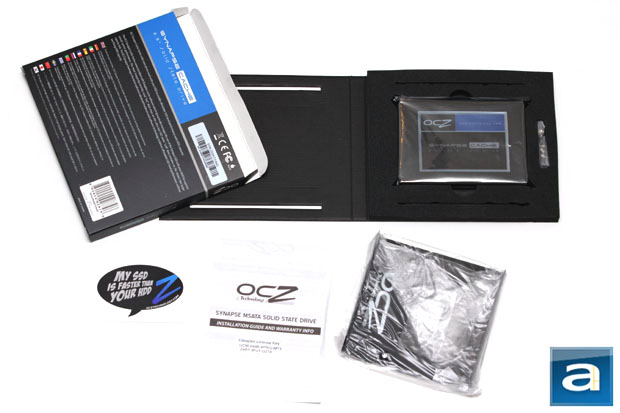 Inside the retail box is familiar black package, consisting of a foam bracket sandwiched between a cardboard flap to house its internal contents. Despite the natural ability of SSDs to withstand high impact forces, OCZ made sure everything will end up safe and sound for the end user. After all, no one likes to receive products that are dead on arrival. Out of the box, you will receive an OCZ Syanpse 64GB caching SSD inside an anti-static bag, 3.5" adapter bracket, eight screws (Four for attaching your SSD to the adapter bracket, with the remaining four for installing it into your chassis), installation/warranty guide, and a not-so-modest "My SSD is faster than your HDD" sticker. Well, except for the fact that the Synapse will have to partner with an HDD, but that is besides the point, haha.