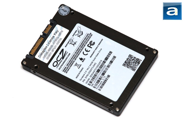 Turning the SSD around reveals a familiar metal backplate -- except this time, there is no exposed printed circuit board like you would normally see with a traditional hard disk drive. The only thing that is common between the Synapse caching SSD and a traditional hard disk drive is its SATA 6Gb/s and its corresponding power connector at the end. As shown in our photo above, you will find a large label with the usual series certification logos and warning statements, along with information on drive model, capacity, serial number, and part number. The smaller adjacent label has the Dataplex license key printed on it, as shown in our photo above. As with all OCZ SSDs, they are all made in Taiwan, and this one is no exception.