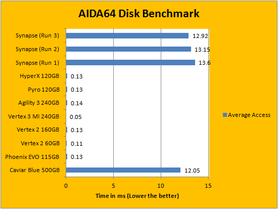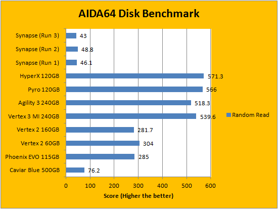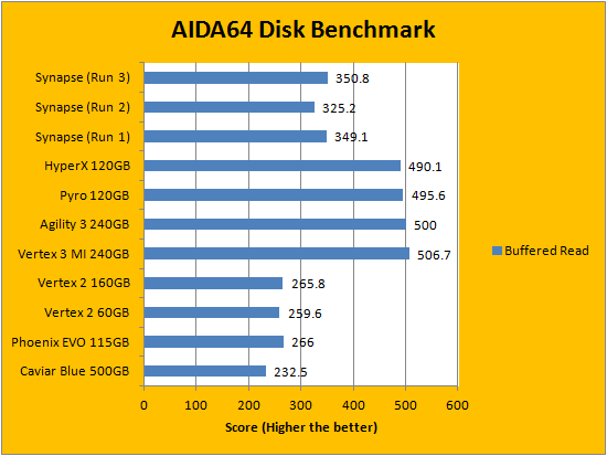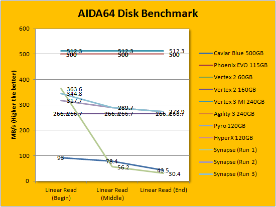 Results obtained from FinalWire's popular AIDA64 benchmarking and diagnostic program is the first set of graphs to make the list. Our configuration did not benefit immediately from the cache drive in the Linear Read test, but the Dataplex algorithm kicked in appropriately after the first run. Interestingly, the Buffered Read benchmark skipped the hard drive right from the beginning -- whereas the other two had nothing to do with the OCZ Synapse 64GB caching SSD. All tests were run three times to adhere to the design of the hardware and software setup, and will be carried throughout this review.