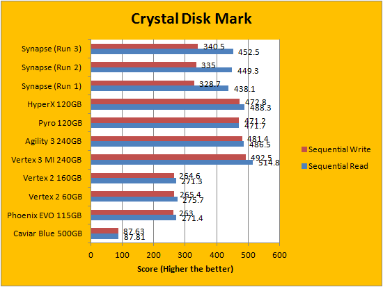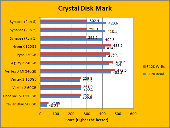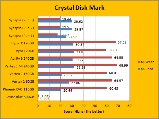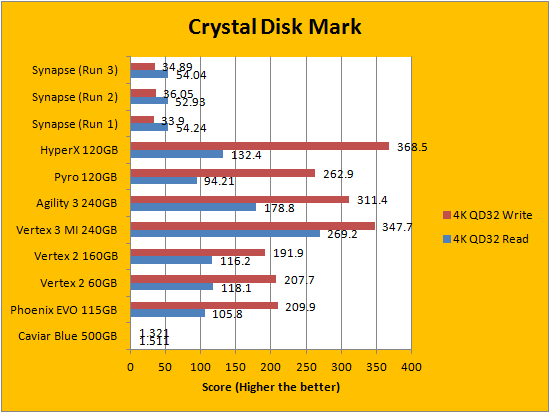 Up next is Crystal Disk Mark 3.0. While the OCZ Synapse 64GB/Seagate Barracuda 7200.10 320GB combination did not perform as well as other SandForce SF-2281 based drives, surprisingly, it actually got pretty close on more than one occasion. Regardless of the way you would like to look at it, the Dataplex powered configuration consistently outperformed previous generation SSDs -- and this is very impressive. Again, all tests were run exactly three times to ensure the published results reflect the intent of the manufacturer. As you can see in our charts above, Crystal Disk Mark interacted with the OCZ Synapse almost directly; the HDD was largely ignored throughout.