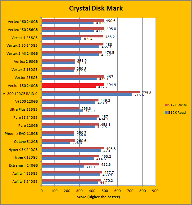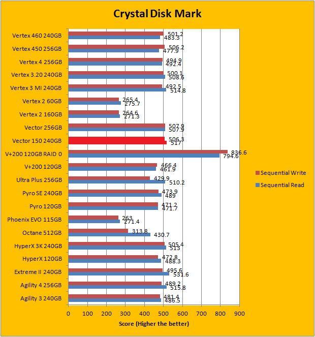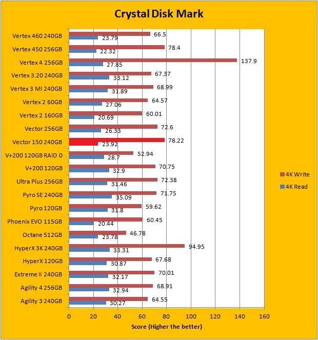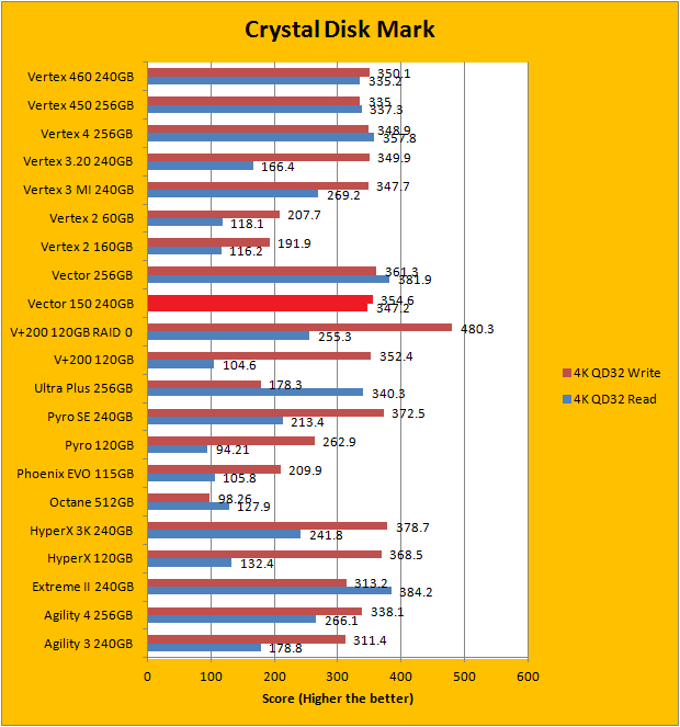 Crystal Disk Mark 3.0 is in the spotlight. Just a bit of background information; higher capacity drives tend to perform a little better in these tests. Drives like the OCZ Vector 150 has a big advantage, because it does not compress data on the fly, In this particular benchmark, the ability of a controller and flash memory to deliver high IOPS will provide huge benefits to the score as well. As you can see in our graphs above, the OCZ Vector 150 240GB performed very well, as expected. OCZ rates the Vector 150 to be capable of delivering 95,000 IOPS, whereas the Vertex 460 is rated at 90,000 IOPS. As such, the Vector 150 is generally a little bit above the Vertex 460 in every test, albeit not by much. Compared to the original Vector, the numbers are lower by about a hair in most tests. That said, the OCZ Vector 150 240GB is still one of the fastest drive to hit the charts on Crystal Disk Mark.