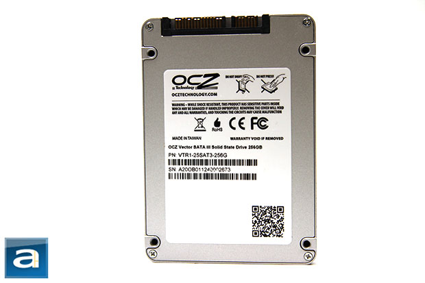 Turning the SSD around reveals a flat metal backplate. This is something users will come to expect from a solid state drive, as there are no exposed printed circuit boards like you would normally see with a traditional hard disk. The only thing that is common between the OCZ Vector 256GB SSD and a traditional hard disk drive is its SATA 6Gb/s and corresponding power connector at the end. As shown in our photo above, you will find a large label with the usual series of certification logos, along with information on the brand, capacity, and serial number. In case you missed it, our particular unit is the OCZ Vector 256GB, haha. As with all OCZ SSDs, they are all made in Taiwan, and this one is no exception.