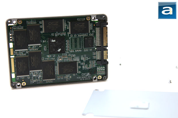 As aforementioned, the Barefoot 3 is the first controller developed 100% in house by OCZ. A thermal pad on the bottom metal casing helps out in dissipating heat away from the controller. The Indilinx Barefoot 3 IDX500M00 is an ARM Cortex architecture processor with a 32-bit OCZ Aragon co-processor at 400MHz. The ARM Cortex processor handles the SATA interface, while the co-processor manages the data moving in and out of the flash memory chips. The 8-channel flash controller features an internal randomizer, ECC engine, and ONFI/Toggle NAND compatibility.