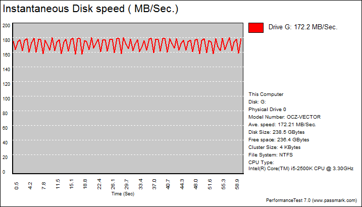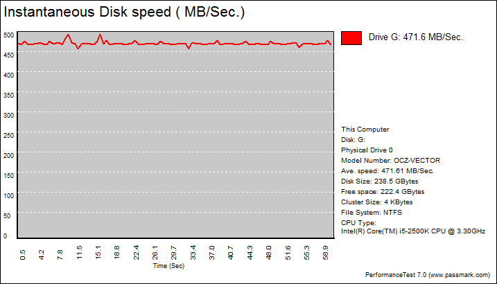 PassMark PerformanceTest 7.0's Advanced Disk Test, unlike HD Tune Pro 4.60, generates some awesome graphs right out of the box. It also provides valuable insight in simulating real world performance applications. To make things clear to you, the first graph simulates a database server, followed by a file server, web server, and workstation. Obviously, PassMark PerformanceTest 7.0 uses highly compressible data in most tests that SandForce based SSDs can really take advantage of. However, it also requires high IOPS capabilities for the best score, and as such, the Vector makes an interesting comparison candidate against best scoring drives like the OCZ Vertex 3 Max IOPS 240GB and Kingston HyperX 3K 240GB. I will even throw in the OCZ Vertex 4 256GB to the mix. One thing clear is the OCZ Vector provides incredibly flat and consistent graphs, which is excellent if you are looking for consistent performance. Its average numbers are also among the best. For the first test, it handily beat the SandForce pair, while just a few megabytes behind the Vertex 4. For the second test, it completely destroyed the Vertex 4, but breaks even with the Kingston HyperX 3K and OCZ Vertex 3 Max IOPS. For the third test, the Vector is the winner by a huge margin -- an epic 60MB/s lead over the next closest. While did not beat out the SandForce duo in the last test, it still remained quite a bit ahead of the Vertex 4.