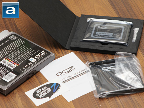 Inside the retail box is completely black package, consisting of a foam bracket sandwiched between a cardboard flap to house its internal contents. Despite the natural ability of SSDs to withstand high impact forces, OCZ made sure everything will end up safe and sound for the end user. Out of the box, you will receive an OCZ Vertex 2 SSD inside an anti-static bag, 3.5" adapter bracket, eight screws (Four for attaching your SSD to the adapter bracket, with the remaining four for installing it into your chassis), installation/warranty guide, and a not-so-modest "My SSD is faster than your HDD" sticker.