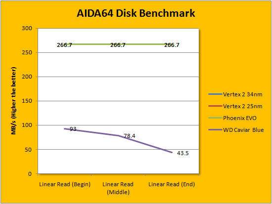 Here is the interesting stuff. If you've ever taken probability and statistics, you will know that in a probability distribution function, the chances of getting an exact value is zero. Well, in this case, against all odds (No pun intended), all three SSDs came out to exactly 266.7MB/s for the linear disk read results. Talk about a weird coincidence. Other than that, the OCZ Vertex 2 60GB 34nm took the lead in our Random Read tests, but fell short of the others in the Buffered Read results. Average access time is virtually nil, as one would expect from an SSD.