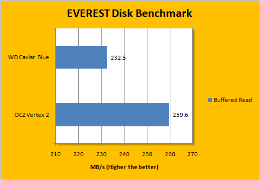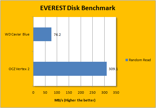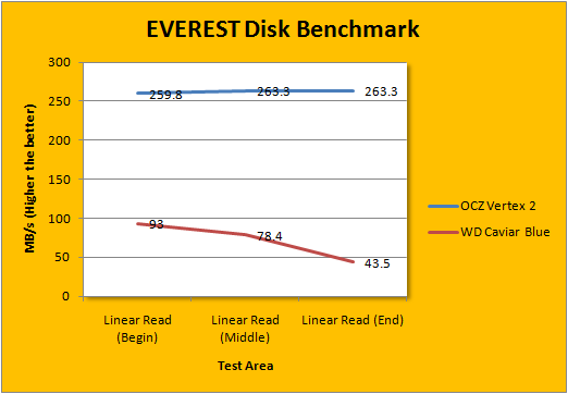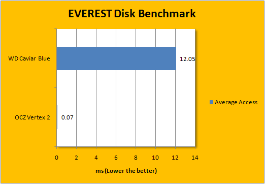 EVEREST takes into account drive performance from the beginning to the end, along with random read and buffered read results. This is also where lack of moving parts on an SSD really pays off -- whereas a mechanical hard drive has a spinning platter and read/write head, an SSD does not; resulting in virtually no latency, as shown in our results above. By this time, it probably is not surprising the SSD's consistently fast performance is untouchable by the reference Western Digital Caviar Blue AAKS 500GB.