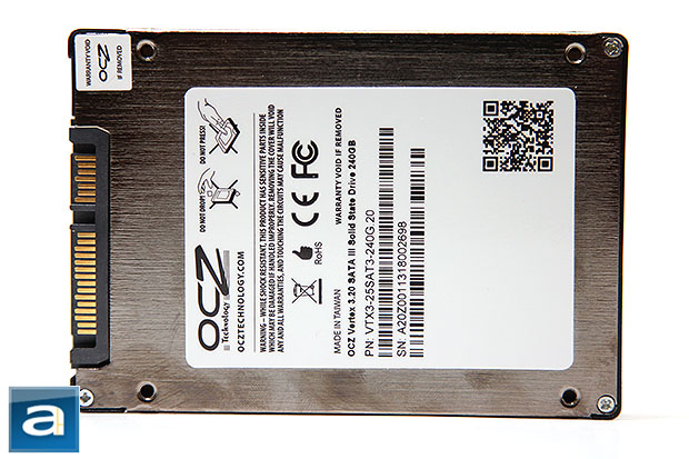 Turning the SSD around reveals a flat metal backplate. This is something users will come to expect from a solid state drive, as there are no exposed printed circuit boards like you would normally see with a traditional hard disk. The only thing that is common between the OCZ Vertex 3.20 240GB SSD and a traditional hard disk drive is its SATA 6Gb/s and corresponding power connector at the end. As shown in our photo above, you will find a large label with the usual series of certification logos, along with information on the brand, capacity, and serial number. In case you missed it, our particular unit is the OCZ Vertex 3.20 240GB, haha. As with all OCZ SSDs, they are all made in Taiwan, and this one is no exception.