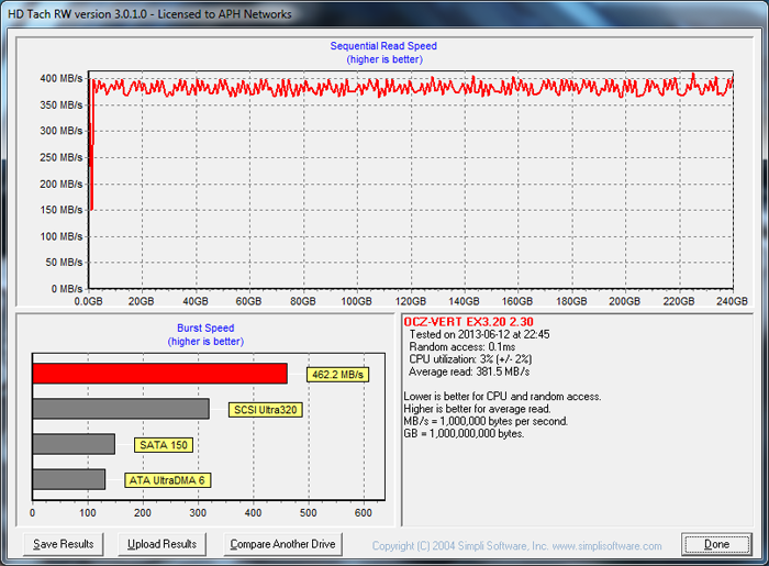 After giving the OCZ Vertex 3.20 240GB a clean format and ensuring alignment and everything is correct, I fired it up for some testing in HD Tach. While HD Tach is more of a 'drag race' than a clear indication of real life performance, it is an excellent storage performance reference among SSDs with the same controller, and has been our favorite benchmark long before hard drives even cracked the 50MB/s mark. With an average read speed of 381.5MB/s according to HD Tach in single disk configuration, again, this is only slightly behind the OCZ Vertex 3 Max IOPS 240GB at 383.4MB/s. Just for reference, the fastest SandForce drive we have ever tested in this test is the Kingston SSDNow V300 120GB at 400.9MB/s, with the record going to SanDisk's Ultra Plus 256GB at 436.9MB/s. Prior to this, the fastest SandForce based 240GB drive in this test, the Patriot Pyro SE 240GB, delivered 'only' 388.8MB/s.