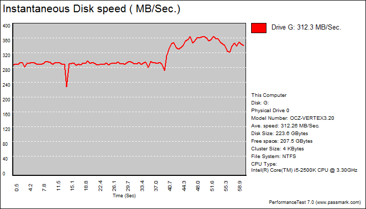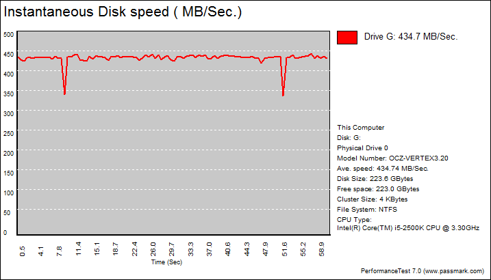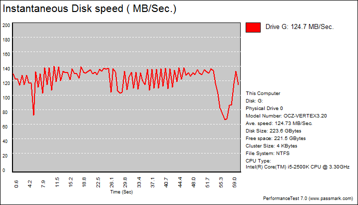 PassMark PerformanceTest 7.0's Advanced Disk Test, unlike HD Tune Pro 4.60, generates some awesome graphs right out of the box. It also provides valuable insight in simulating real world performance applications. To make things clear to you, the first graph simulates a database server, followed by a file server, web server, and workstation. Obviously, PassMark PerformanceTest 7.0 uses highly compressible data in most tests that SandForce based SSDs can really take advantage of. However, it also requires high IOPS capabilities for the best score, and as such, the OCZ Vertex 3.20 240GB could not quite match the OCZ Vertex 3 Max IOPS 240GB. For reference, the MI variant posted numbers of 153.9MB/s, 460.7MB/s, 409.3MB/s, and 89.0MB/s, respectively. The 3.20 is slightly ahead in the Workstation results, but scored noticeably lower in Database, File Server, and Web Server benchmarks.