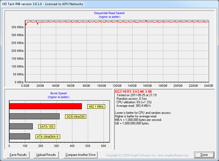 After giving the OCZ Vertex 3 Max IOPS 240GB a clean format and ensuring alignment and everything is correct, I fired it up for some testing in HD Tach. While HD Tach is more of a 'drag race' than a clear indication of real life performance, it is an excellent storage performance reference, and has been our favorite benchmark long before drives even cracked the 50MB/s mark. With an average read speed of 383.4MB/s according to HD Tach, again we are looking at significant increases over the Vertex 2's results; which hovers around the 230MB/s mark. If 230MB/s is insanely fast, then what the heck is this?