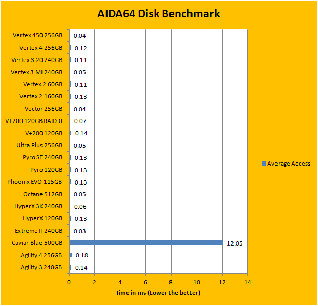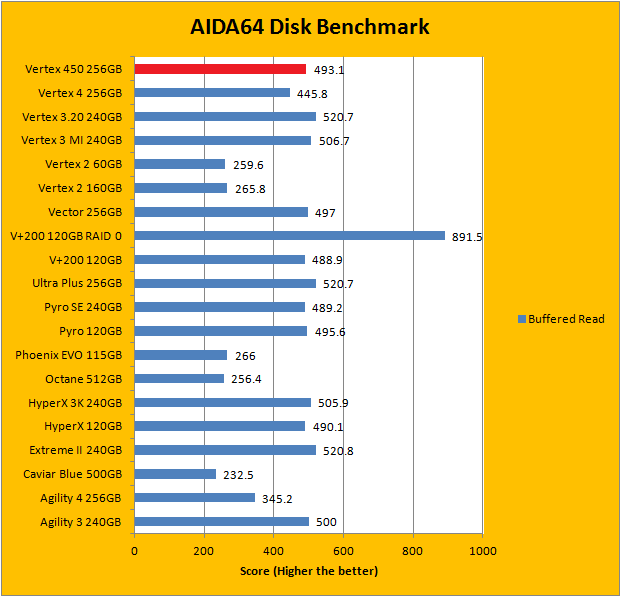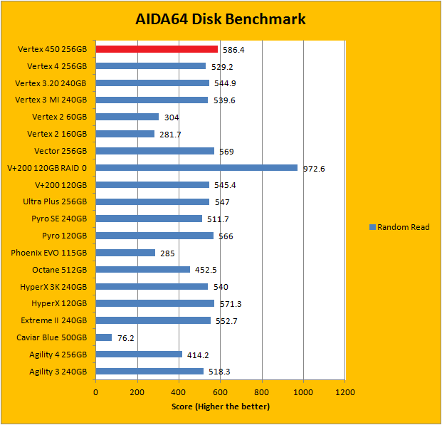 Since our SSD review benchmark results are presented in alphabetical order, first up on the list are results from one of our favorite benchmarking programs, AIDA64 Extreme Engineer. Just to note, AIDA64 Extreme Engineer is a full synthetic benchmark. Unlike full synthetic motor oil, this usually does not carry a good connotation, but it does provide valuable insight into performance between different drives and different controllers. As you can see in our graphs above, the Barefoot 3 based OCZ Vertex 450 is consistently among the top, just like the OCZ Vector. Delivering linear read results of 526.1MB/s, random read of 586.4MB/s, and buffered read of 493.1MB/s, this is a very familiar performance signature. Its average access time of 0.04ms is also the best we have tested so far here at APH Networks; with the other one getting the same mark none other than its bigger brother.