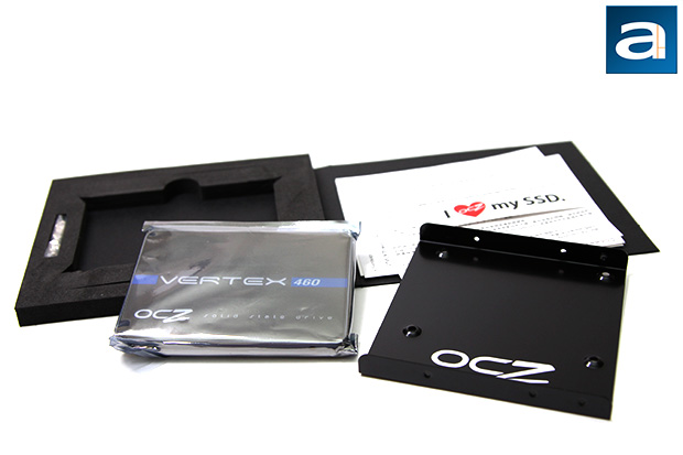 Inside the retail box is familiar black package, consisting of a foam tray enclosed by a cardboard flap to house its internal contents. Despite the natural ability of SSDs to withstand high impact forces, OCZ made sure everything will end up safe and sound for the end user. After all, despite the price drop in recent years, this is still pretty expensive stuff. Out of the box, you will receive an OCZ Vertex 460 240GB SSD inside an anti-static bag, 3.5" adapter bracket, eight screws (Four for attaching your SSD to the adapter bracket, with the remaining four for installing it into your chassis), installation/warranty guide, and a "I <3 my SSD" sticker with OCZ's logo in the heart icon. The company also includes a license key for Acronis' True Image HD software for transferring data from your old drive to this one. No CD is included, so if you are still stuck in the dinosaur age without internet, then you are out of luck. Frankly, I don't know anyone who has an SSD without internet access, so this is really a moot point.