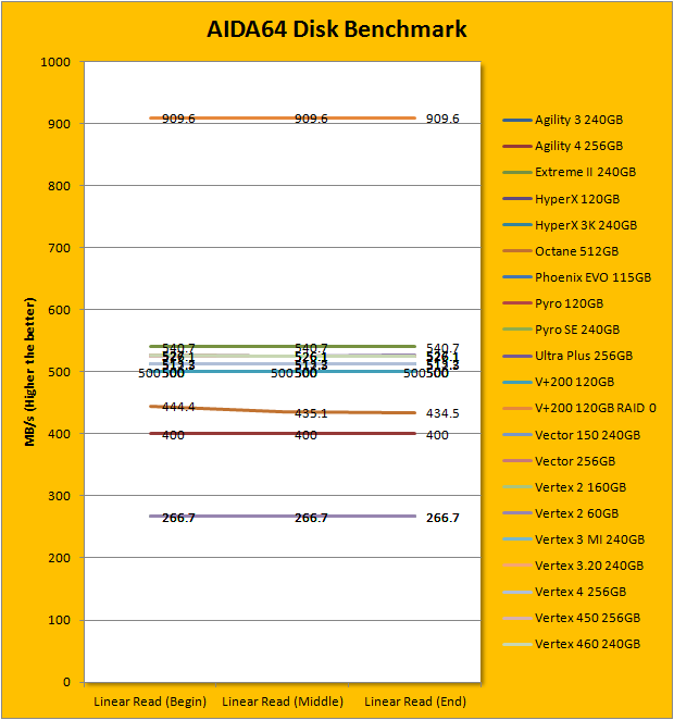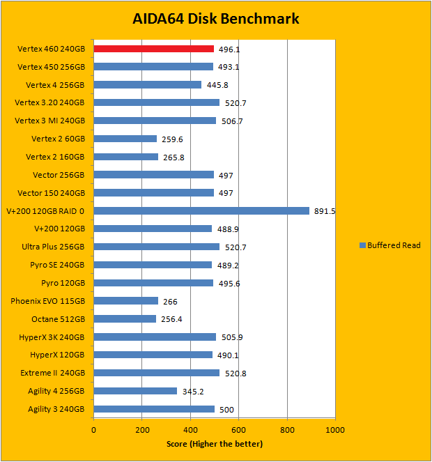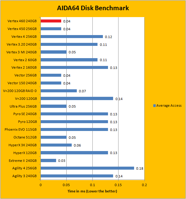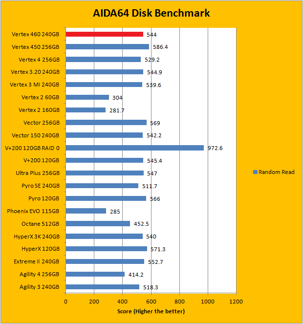 Since our SSD review benchmark results are presented in alphabetical order, first up on the list are results from one of our favorite benchmarking programs, AIDA64 Extreme Engineer. Just to note, AIDA64 Extreme Engineer is a full synthetic benchmark. Unlike full synthetic motor oil, this usually does not always carry a good connotation. While it is not a representation of real life performance (Such as how fast Photoshop opens), it does provide valuable insight into performance between different drives and different controllers. As you can see in our graphs above, the Barefoot 3 based OCZ Vertex 460 is consistently among the top, just like its predecessor, the Vertex 450. Delivering linear read results of 527MB/s, random read of 544MB/s, and buffered read of 496.1MB/s, these figures are almost identical to the Vector 150. Its average access time of 0.04ms is also the best we have tested so far here at APH Networks; it ties with every Barefoot 3 drive we have tested in the past.