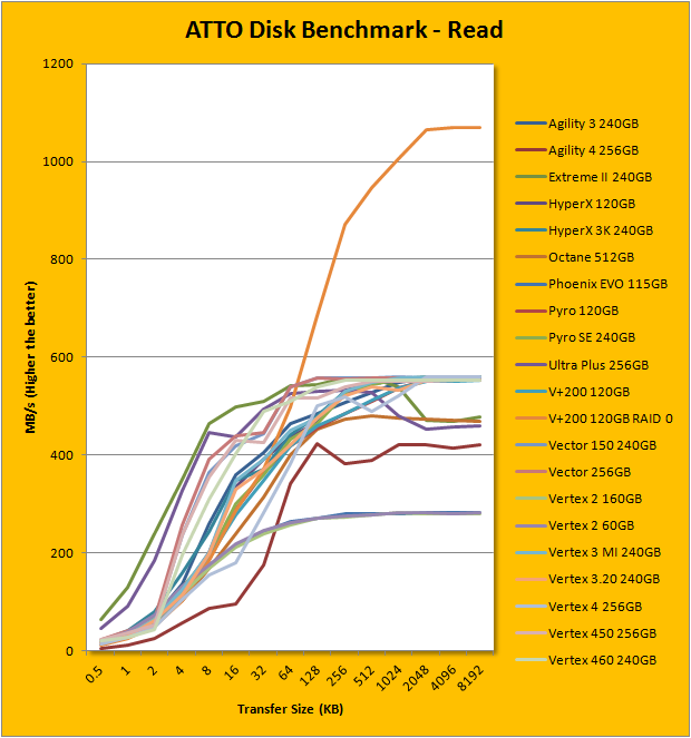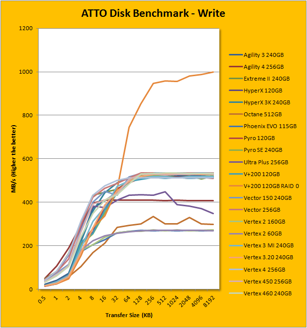 Following up next is our usual ATTO read and write tests. ATTO is an often quoted benchmark, because it is easy to use and accurate. For the most part, it is a favorite among reviewers, and I have grown to embrace it as much as the next for the last little while. ATTO uses easily compressible data, so SandForce based SSDs will perform very well here. This means our OCZ Vertex 460 is at a bit of a disadvantage here, since the Barefoot 3 does not use on the fly compression. As manufacturer peak read and write performance ratings can usually be verified by ATTO, whether a drive lives up to its marketing claims or not can be tested by this program. OCZ claims the Vertex 460 240GB's maximum read and maximum write is pinned at 540MB/s and 525MB/s, respectively. Compared to the Vector 150, that's a 10MB/s decrease in the read rating and 5MB/s decrease in write rating. According to our tests, these figures seem to be slightly underrated. It peaked at 552.8MB/s read and 534.1MB/s write in the curves demonstrated in our charts above. Despite its inherent disadvantages, the OCZ Vertex 460 240GB is still among one of the best performers in this test. Under the curve, the Vector 150 delivers slightly lower average performance than the Vertex 450, but only by a very marginal amount.