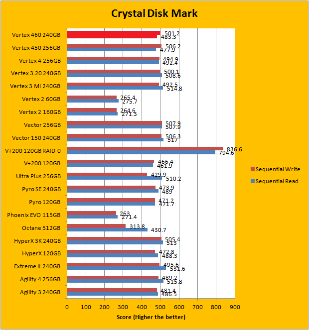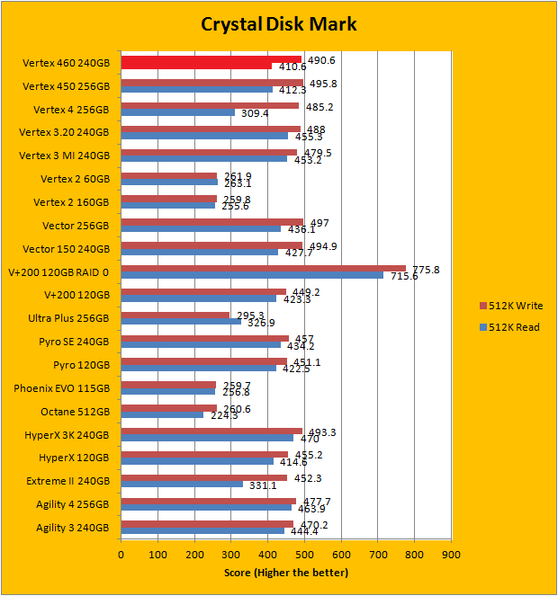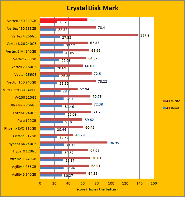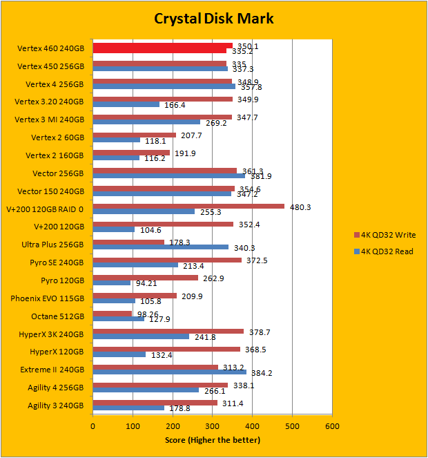 Crystal Disk Mark 3.0 is in the spotlight. Just a bit of background information; higher capacity drives tend to perform a little better in these tests. Drives like the OCZ Vertex 460 has a big advantage, because it does not compress data on the fly, In this particular benchmark, the ability of a controller and flash memory to deliver high IOPS will provide huge benefits to the score as well. As you can see in our graphs above, the OCZ Vertex 460 240GB performed very well, as expected. OCZ rates the Vertex 460 to be capable of delivering 90,000 IOPS, whereas the Vector 150 is rated at 95,000 IOPS. As such, the Vertex 460 is generally a little bit below the Vector 150 in every test, albeit not by much. Compared to the Vertex 450, the numbers are really close. With that in mind, the OCZ Vertex 460 240GB is among the fastest drives to hit the charts on Crystal Disk Mark.