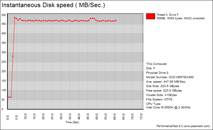 PassMark PerformanceTest 8.0's Advanced Disk Test, unlike HD Tune Pro 4.60, generates some awesome graphs right out of the box. It also provides valuable insight in simulating real world performance applications. To make things clear to you, the first graph simulates a database server, followed by a file server, web server, and workstation. Obviously, PassMark PerformanceTest 8.0 uses highly compressible data in most tests that SandForce based SSDs can really take advantage of. However, it also requires high IOPS capabilities for the best score, and as such, the Vertex 460 240GB makes an interesting candidate. One thing clear is the OCZ Vertex 460 provides incredibly flat graphs, which is excellent if you are looking for strong consistent performance. Overall, the Vertex 460 was beaten by a good margin by the Vector 150 in the Database Server simulation, but the Vertex 460 actually outperformed the Vector 150 in the File Server benchmarks. As far as Web Server and Workstation is concerned, the Vector 150 marginally lead the Vertex 460 by a few megabytes per seconds in both tests.