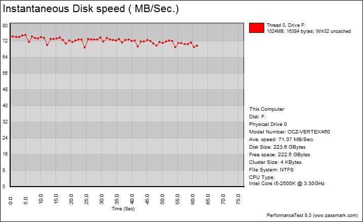 This Advanced Disk Test, which is part of PerformanceTest, measures the data transfer speed when reading or writing data to one or more disks. The speed that data can be transferred between memory and a hard disk drive is one of a system's most important performance aspects. There are quite a few factors which have a bearing on this speed and the Advanced Disk Drive Test allows the user to vary most of these factors and compare the results.