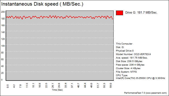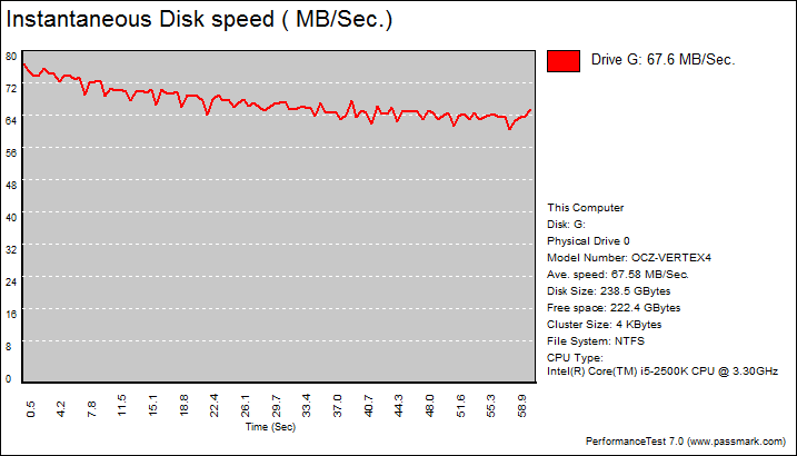PassMark PerformanceTest 7.0's Advanced Disk Test, unlike HD Tune Pro 4.60, generates some awesome graphs right out of the box. It also provides valuable insight in simulating real world performance applications. To make things clear to you, the first graph simulates a database server, followed by a file server, web server, and workstation. Obviously, PassMark PerformanceTest 7.0 uses highly compressible data in most tests that SandForce based SSDs can really take advantage of, but the OCZ Vertex 4 256GB has much higher IOPS capabilities than any SF-2281 drives we have ever tested. Compared against the OCZ Vertex 3 Max IOPS 240GB, the Vertex 4 256GB posted better numbers than its predecessor only in the database server simulation. Once again, SandForce drives have an inherent advantage over other drives due to the way the controller is designed, but this may not always be indicative of an SSD's true performance with different controllers.