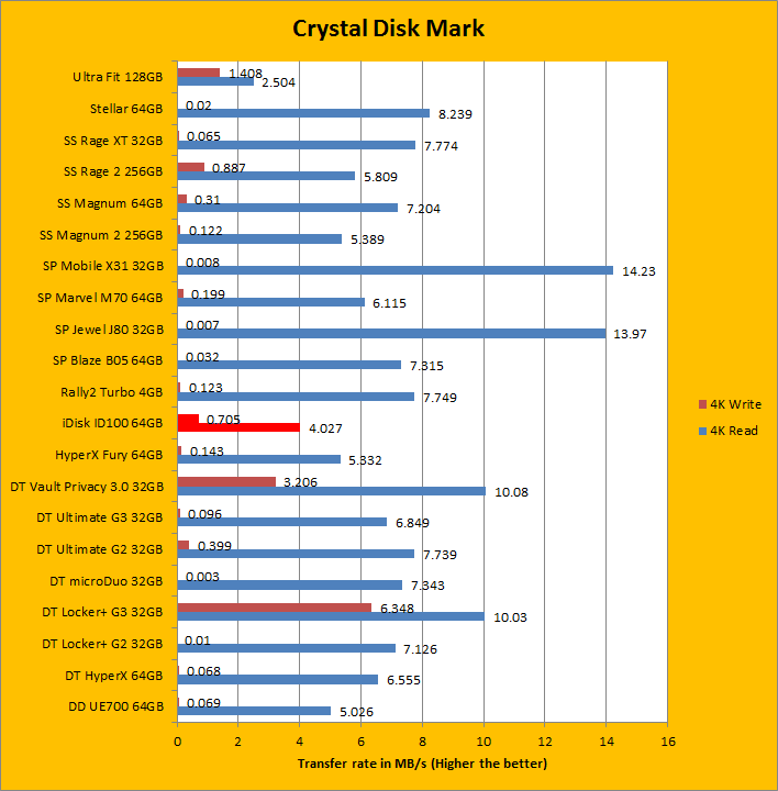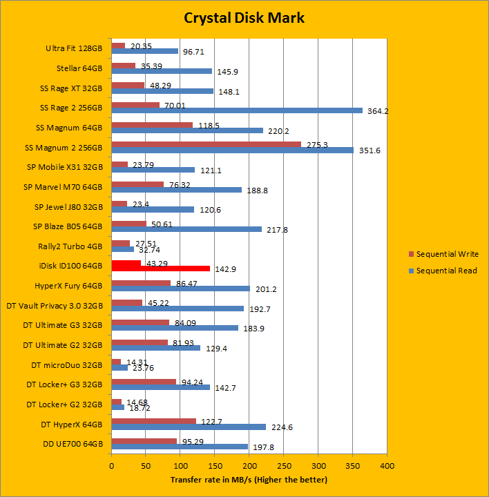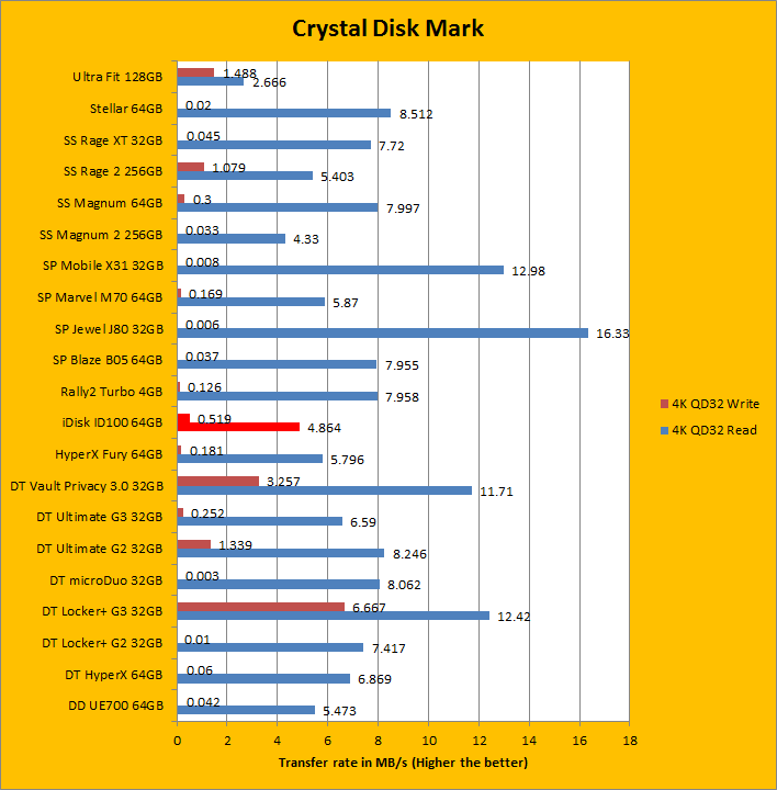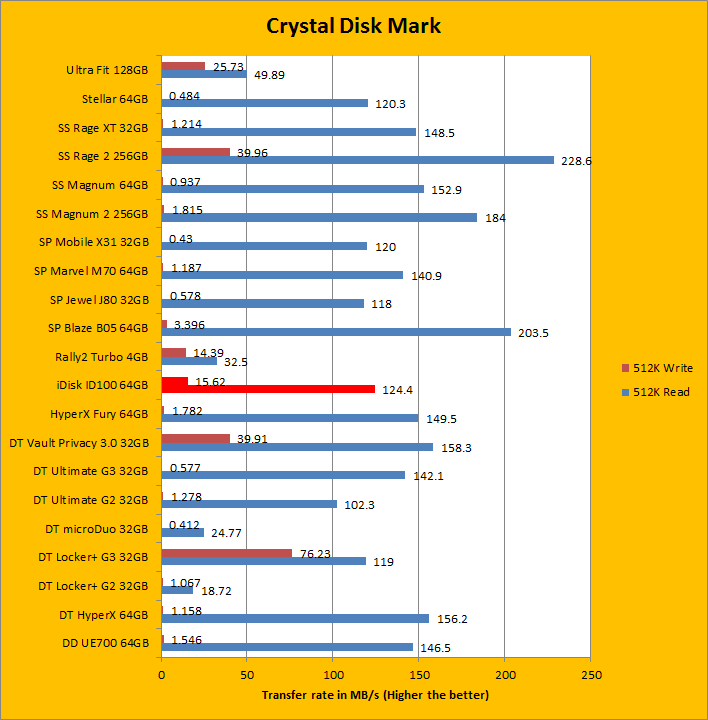 From the previous results, we know the OLALA iDisk ID100 64GB is not aiming at a very high data rate. The testing results from the Crystal Disk Mark also suggest the same thing. As you can see from the figures above, the sequential write and read speeds were 43.29 MB/s and 142.9 MB/s, respectively; the 512K write and read speeds were 15.62 MB/s and 124.4 MB/s, respectively. Those results show the OLALA iDisk ID100 64GB has only average performance in terms of the data transfer rate. On the other hand, the test results of the 4K write and read performance of today's review unit was actually below average, which means it has relatively low input/output operations per second.