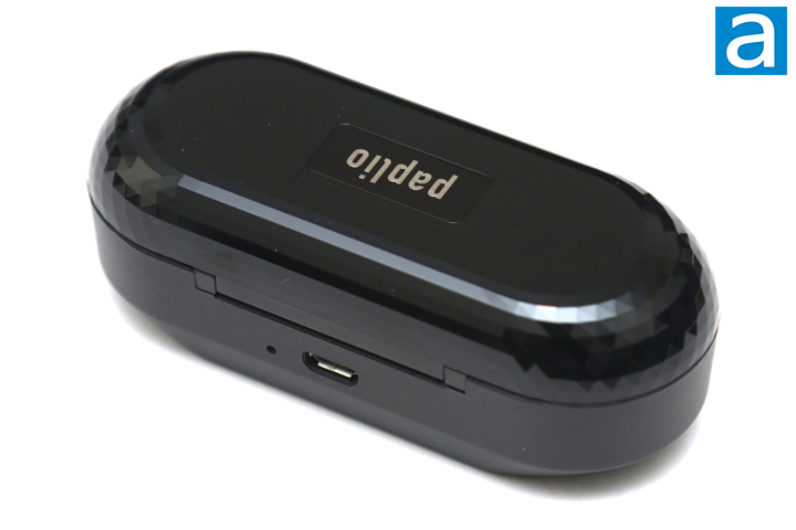 As for the carrying case, the paplio Dash's plastic case doubles as a charger for the headphones. It measures 92mm in length, 36mm in depth, and 32mm in height. This makes the case longer, but slightly shorter and less deep than the case with the Momentum True Wireless. It has a gloss finish with a paplio logo on the top. This top shell is made out of a thinner plastic and is slightly translucent so you can see the indicator lights on the Dash headphones. It also swings open with a press of the button on the outside. At the back, we have another pinhole LED and a micro USB input. The pinhole LED flashes red to show users the battery status of the case itself, depending on the number of flashes it shows. This also only illuminates when the headphones are inside and charging or when the case is plugged in. Otherwise, I would have liked to see the newer USB Type-C plug here.