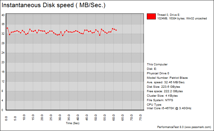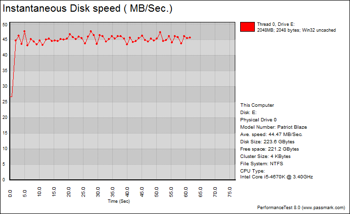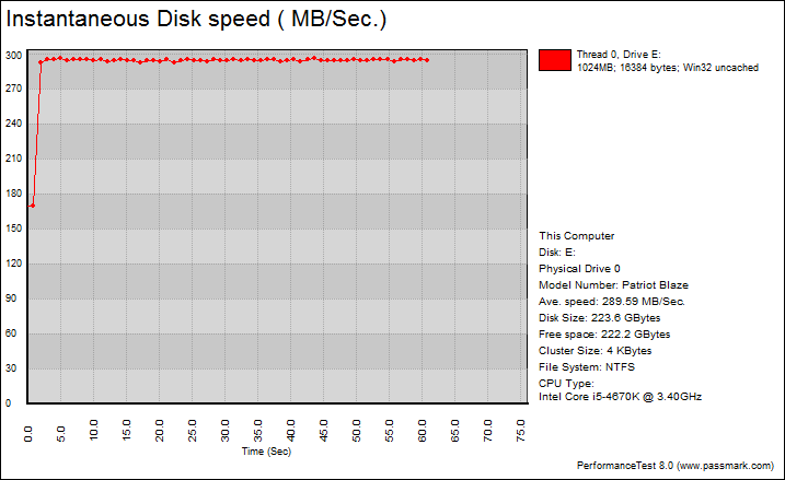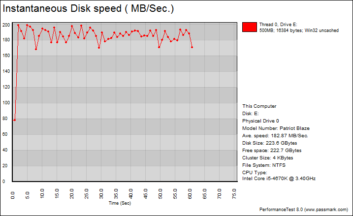 Finally, we get to a benchmark that generates some nice graphs right out of the box. PassMark PerformanceTest 8.0's Advanced Disk Test provides valuable insight in simulating more real world performance applications. The tests simulate a database server, followed by a file server, web server, and workstation, in that order. PassMark PerformanceTest 8.0 uses highly compressible data in most tests, so once again, SandForce based SSDs will really take advantage of this. However, it also requires high IOPS capabilities for the best score. Unfortunately, this seems to be the bane of the Patriot Blaze 240GB. All of the test average speeds are surprisingly low, even in comparison to the OCZ ARC 100. Comparatively, the SanDisk Ultra II pulled in numbers of 105.59MB/s, 345.68MB/s, 433.65MB/s, and 88.68MB/s, completely obliterating its competition. The only good thing is majority of the graphs are flat, which is excellent for consistency in performance.