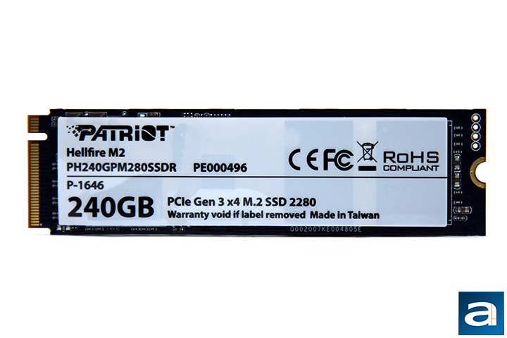 Flipping the Patriot Hellfire M.2 240GB around, and you will find few components of interest. At the heart of Patriot's Hellfire M.2 240GB is a quad core Phison PS5007-E7 controller. It is an NVMe solution on the M.2 socket to overcome traditional Serial ATA bandwidth bottlenecks, with support for 8-channel flash access. Other features include SmartECC, SmartFlush, GuaranteedFlush, built in static and dynamic wear leveling, L1.2 power saving mode, and end to end data path protection. On the SSD itself, Patriot posts no power consumption rating. I think it is safe to assume it uses quite a bit of power, as this is a high performance product.