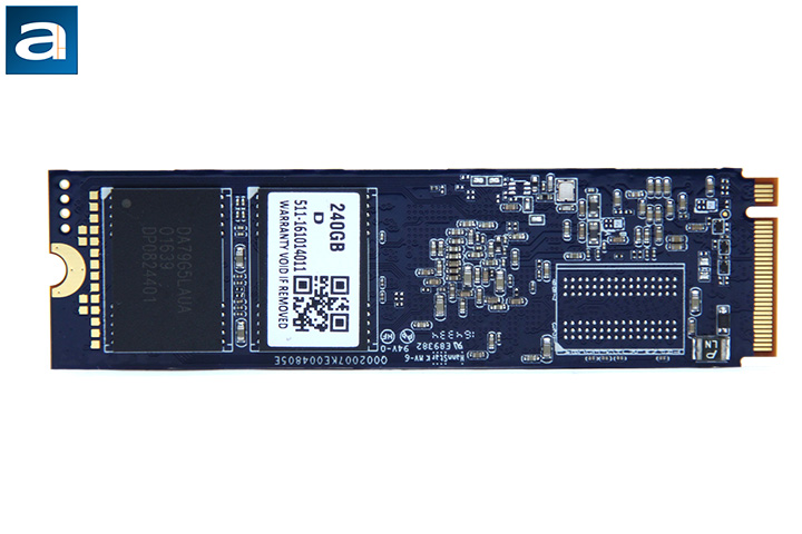 A total of four NAND flash chips are found on the Patriot Hellfire M.2 240GB solid state disk, with two of them on each side. I cannot find any more information on what the NAND flash memory labeled "DA79G5LAUA" is, but I do know they are multi-level cells with a capacity of 64GB per integrated circuit chip. The SSD has a decent rated write endurance of 115TB, which equates to roughly 63GB per day for five years. 16GB out of the 256GB total capacity (Just under 7%) is provisioned for the drive controller for overhead, so the actual usable space is 240GB, as advertised. You will see 223GB in Windows. One Nanya branded NT5CC128M16IP-DI 256MB DDR3L-1600 chip is present; it is used by the Phison PS5007-E7 controller for system memory.