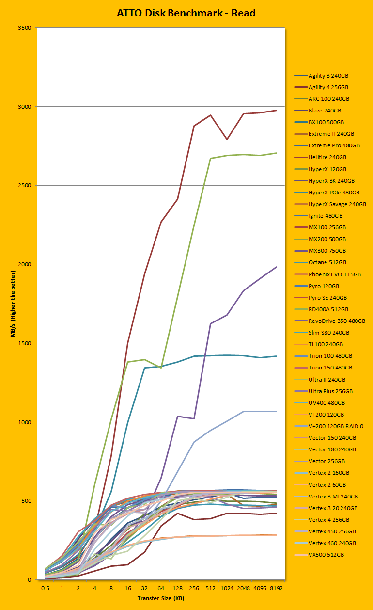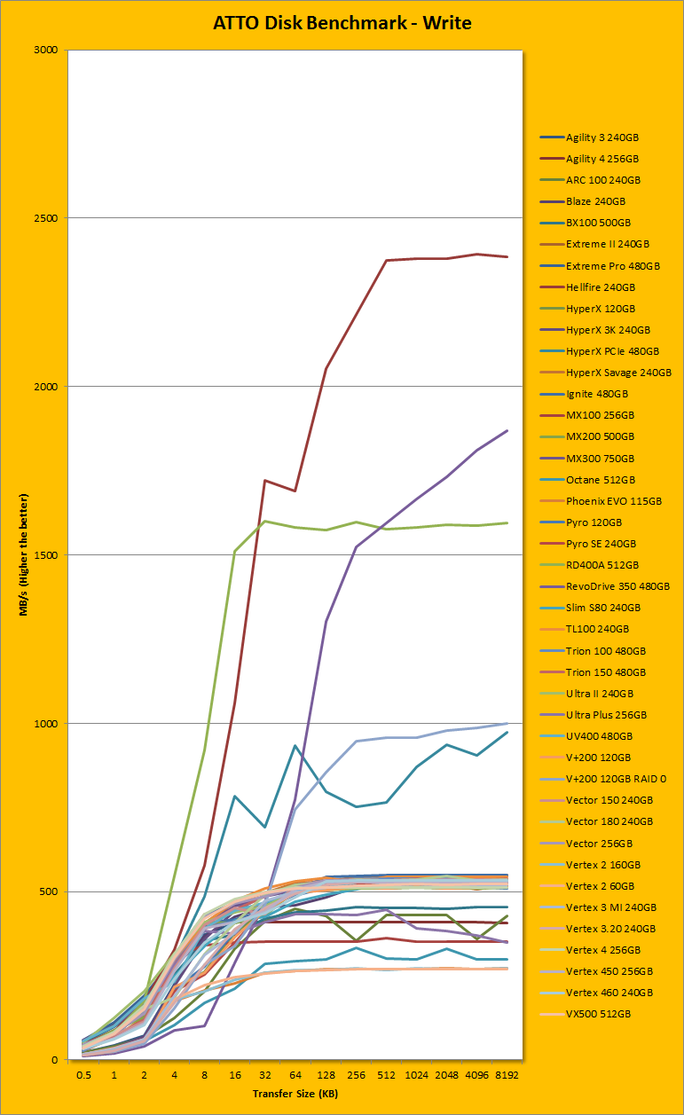 Following up next is our usual ATTO read and write tests. ATTO is an often quoted benchmark, because it is easy to use and accurate. For the most part, it is a favorite among reviewers, and I have grown to embrace it as much as the next for the last little while. ATTO uses easily compressible data, so SandForce based SSDs and similar will perform very well here; as far as the Patriot Hellfire M.2 240GB is concerned -- well, here are our results. As manufacturer peak read and write performance ratings are usually obtained using ATTO, whether a drive lives up to its marketing claims or not can be validated by this program. Patriot claims the Hellfire M.2 240GB's maximum read and maximum write are pinned at 3000MB/s and 2300MB/s, respectively. According to our tests, these numbers were almost bang on. It peaked at 2975.269MB/s read and 2391.999MB/s write. This is the best we have ever seen on this website. Under the curve, things looked a little fit funky. In the write category, we have seen faster ramp ups, and it was quite progressive until it reached near-peak at 128K. From 4K to 16K, the RD400A was significantly faster. In the read category, a different observation could be made. It was pretty close to the Kingston HyperX Predator PCIe 480GB's unbelievably fast 0.5K to 2K, but beyond that, the RD400A had an advantage between 4K and 8K. From 16K forward, the Patriot Hellfire M.2 240GB was the fastest drive we have tested here at APH Networks, reaching near-peak at 128K once again. Needless to say, the Patriot Hellfire M.2 240GB did generally really well in this benchmark.