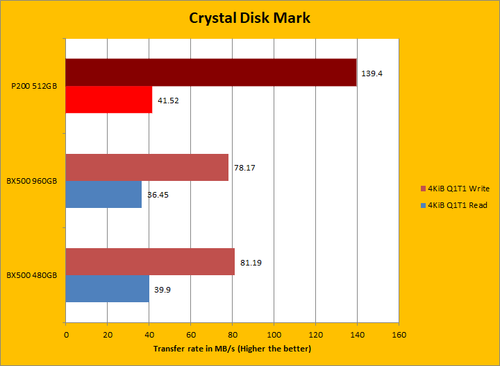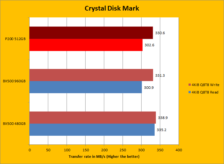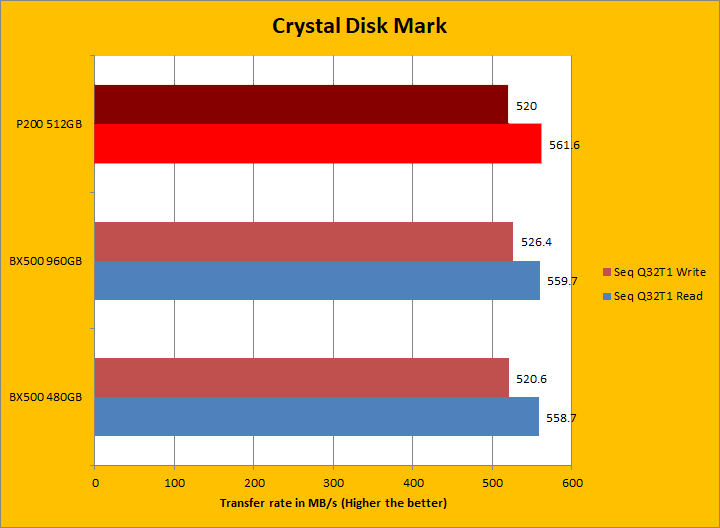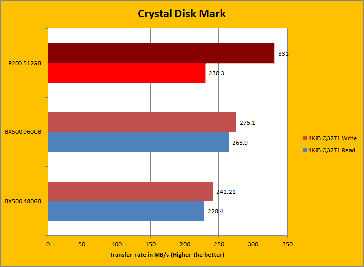 Crystal Disk Mark 6.0 is our third test. Just a bit of background information; higher capacity drives tend to perform a little better in these tests. The ability of a controller and flash memory to deliver high IOPS will provide huge benefits to the score as well. We only recently swapped over to the sixth version of Crystal Disk Mark, so we do not have all of the drives tested here. With the drives we do have, compared to the two BX500 drives, we can see the Patriot P200 512GB compared similarly. Its sequential tests were similar to the other two drives. Moving to the 4K tests, the Patriot P200 kept up with both of the Crucial drives, and actually leapt ahead for the 32-queue depth in terms of write. The single queue and thread test also showed favorable numbers for the P200 512GB, which was good to see.