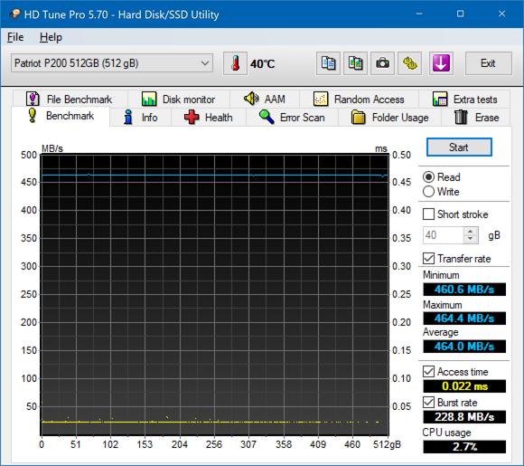Unfortunately, HD Tune does not generate any fancy independent graph outputs in particular, so I just used a screenshot. Like our HD Tach results on the previous page, the line was fairly flat overall. It differed slightly in magnitude than the other program -- probably due to testing algorithms used -- but its performance characteristics were identical in practice. Other than that, the results were similar across the range; the recorded access time was very low, as we would expect from a solid-state drive. The Patriot P200 512GB posted an average of 464.0MB/s for its sequential read speed. Do keep in mind the discussion we had on the previous page, as it still applies here.