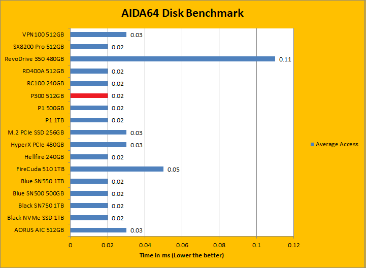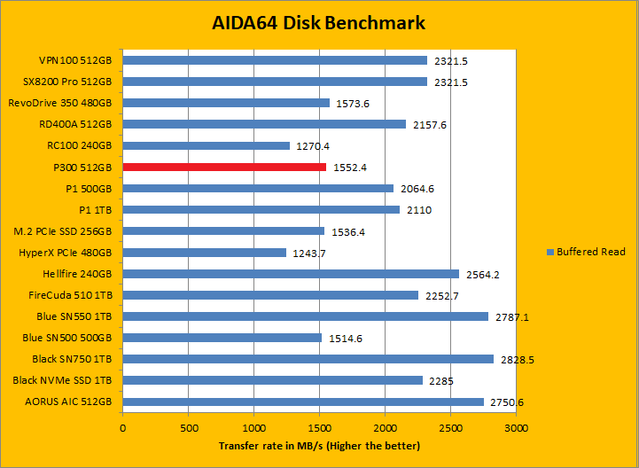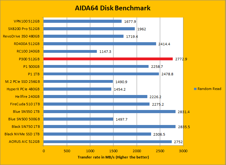 As our SSD review benchmark results are presented in alphabetical order, first up on the list are results from one of our favorite benchmarking programs, AIDA64 Engineer. AIDA64 Engineer is a fully synthetic benchmark. This means it is not necessarily a direct representation of real-life performance, such as how fast applications start or how fast it takes to start up your operating system. However, it does provide valuable insight into performance between different drives and different controllers. From the graphs above, the Patriot P300 512GB performed quite well. In the linear read test, the P300 512GB was the third fastest drive overall, only losing out to the Western Digital Blue SN550 and Black SN750 drives. Continuing to the random read tests, the P300 was once again ranked third in its numbers. However, in its buffered read tests, the results were notably slower at only 1552.4MB/s. The tested random-access time was 0.02ms, which was tied for the lowest among all the drives. The rest of the comparison results against all the other drives can be seen in our graphs above. While these test results are quite favorable, these are still synthetic tests, so let us continue on.