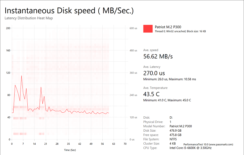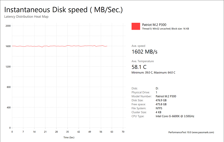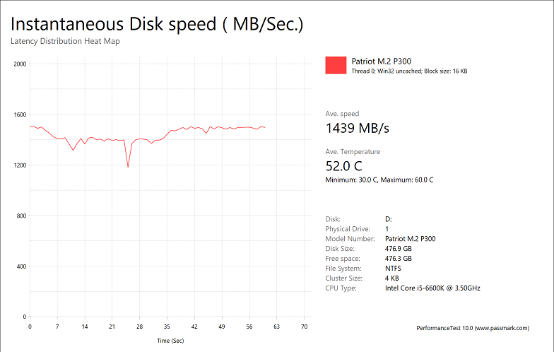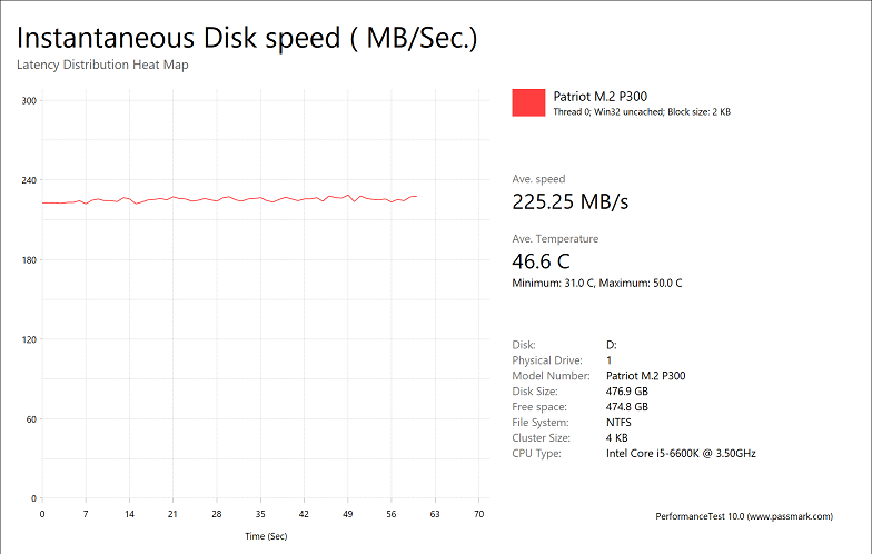 Overall, the Patriot P300 512GB performance was good overall. With results of 225.25MB/s, 1439MB/s, 1602MB/s, 56.62MB/s, these numbers are slower in three of the four tests when compared to the WD Blue SN550 1TB, which had numbers of 235.65MB/s, 569MB/s, 1919MB/s, and 136.14MB/s. Even so, these are mostly faster numbers when compared to the Crucial P1 500GB's numbers of 121.08MB/s, 392.68MB/s, 593.74MB/s, and 90.75MB/s. This is also mostly better than the Toshiba RC100 240GB, which had numbers of 91.11MB/s, 917.77MB/s, 1203MB/s, 83.21MB/s. For some context however, the similarly-priced SATA-based Crucial MX500 had mostly slower numbers at 155.76MB/s, 434.76MB/s, 488.07MB/s, and 73.11MB/s, in the same respective order.
