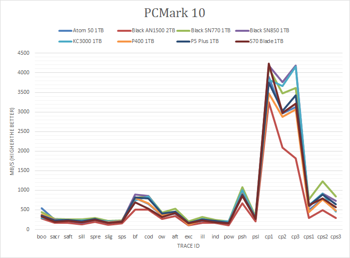 As seen in our graphs above, the Patriot P400 1TB roughly fell in the lower half of the scores. Its overall score only beat out the XPG Gammix S70 Blade 1TB, XPG Atom 50 1TB, and Western Digital WD_BLACK AN1500 2TB drives. All throughout the twenty-three traces, the P400 1TB scored anywhere from the middle of the pack to the bottom. It did decently well on booting Windows 10 and using Photoshop heavily. While these real-life tests results are much like the other tests, that being a mixed bag, I am not surprised given the DRAM-less nature of this budget drive.