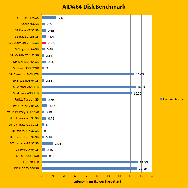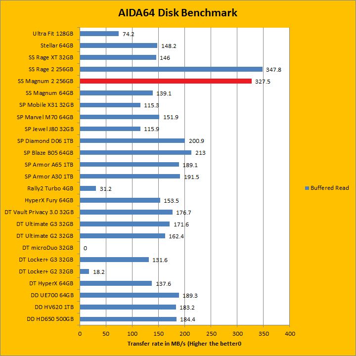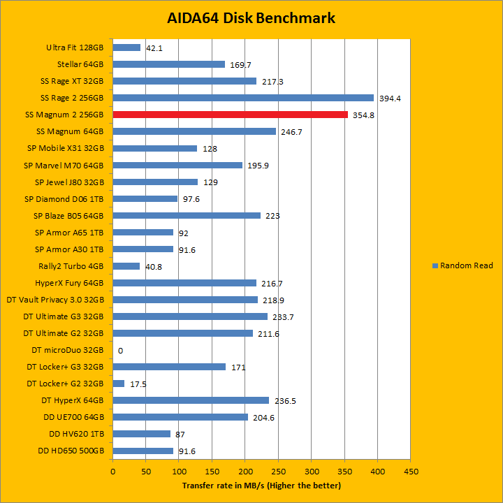 As with all our removable storage reviews, I would just like to make it clear from the start we have a large mix of hard drives and flash drives on the list, so when comparing results, be sure to do so contextually. AIDA64 results provide interesting insight to the performance of the Patriot Supersonic Magnum 2 256GB as a performance USB flash drive. Delivering up to 356.2MB/s sequential read, 354.9MB/s random read, and 327.5MB/s buffered read, it is a significant increase of about 50% compared to its predecessor. However, all of these figures trail the Supersonic Rage 2 256GB. Its 0.75 ms random access time is pretty decent, but once again, it trailed its corporate cousin So far, for 256GB of USB 3.0 storage, the Supersonic Magnum 2 is one of the fastest drives we have ever seen here at APH Networks.